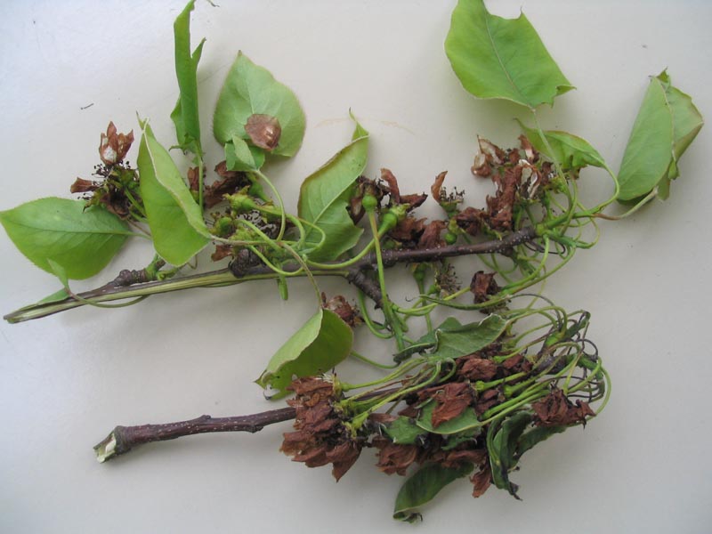 To bi lahko bil hrušev ožig. Čim prej pokliči fitosanitarno inšpekcijo. Oni ti bodo sigurno znali povedati ali je, ali ni. Ne odlašaj, saj se lahko razširi tudi na jabolka in hruške. Če ne boš poklical sam, bodo lahko to odkrili sami. V najslabšem primeru ti grozi odločba o požigu celotnega sadovnjaka. Če je bolezen samo na enem drevesu se tega sežge in stvar je zaključena. Drugače pa jo lahko raznosijo okoli tudi živali.